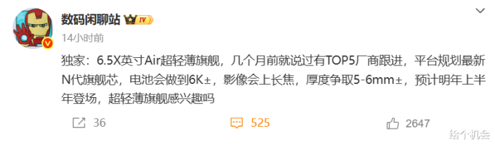 近期苹果发布了新机iPhone 17系列,增加了一款超薄的Air产品,这次创新不知道大众是否能接受,但国产厂商已经开始借鉴了,据博主数码闲聊站爆料,有国产厂商会跟进6.5英寸Air超超薄旗舰,厚度也控制在5-6mm之间。